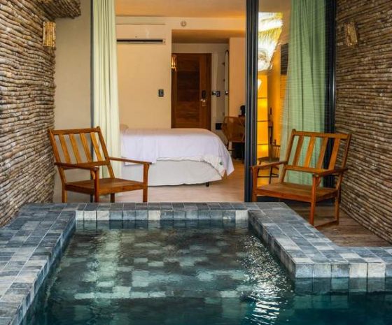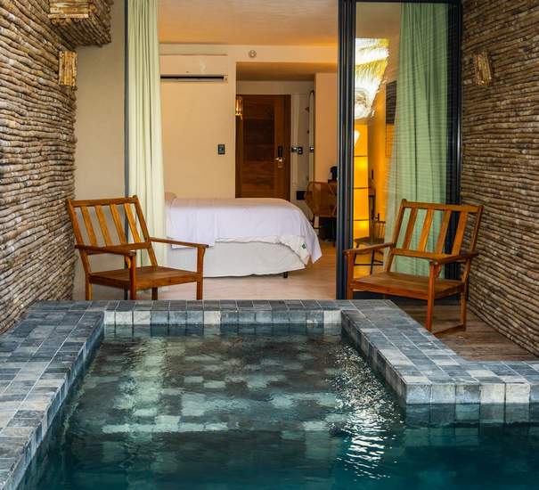 - L’Océan Pool Suite dispose d’une vue panoramique privilégiée sur l’océan et d’une petite piscine privée, offrant une atmosphère paisible et intime. Cette suite spacieuse de 30m2 est équipée d’un grand lit Queen size (160 cm), de l’air conditionné, d’une TV Smart 65″, d’un minibar, d’un balcon privé, d’une machine à café avec capsules gratuites, d’un coffre-fort et d’une salle de bain privative avec douche et sèche-cheveux.