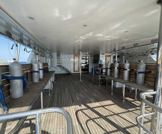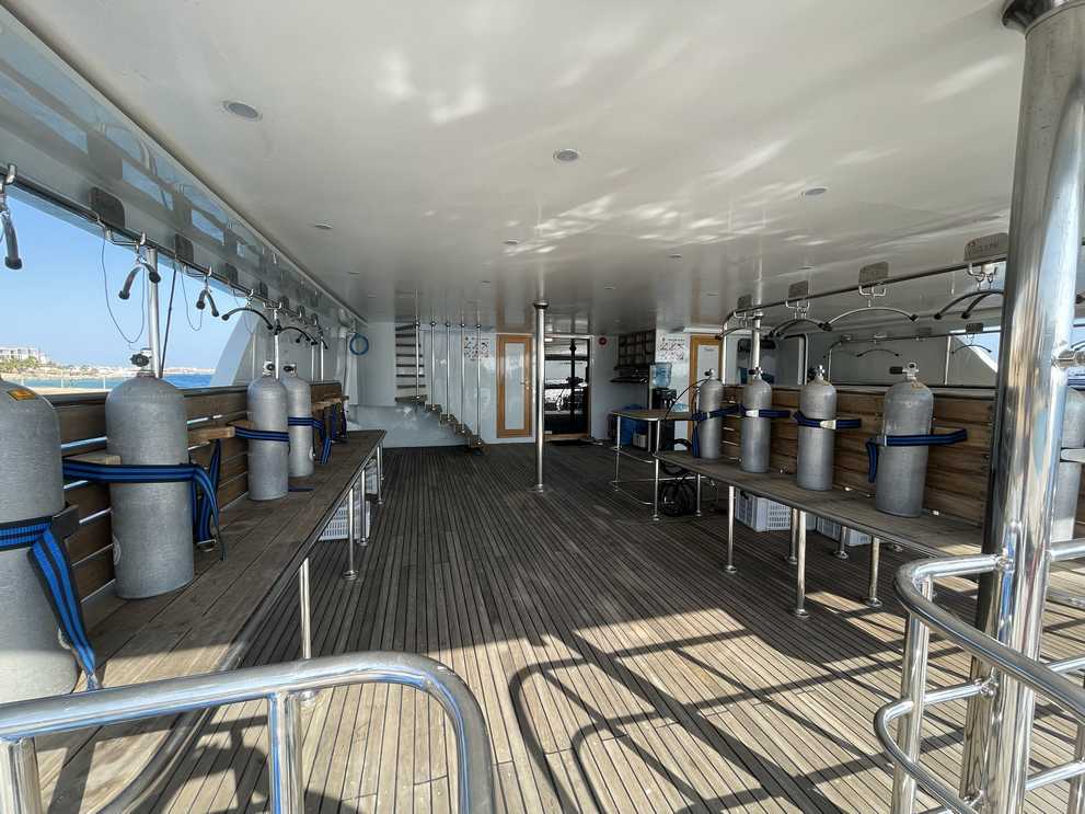 La plateforme de plongée située sur le pont principal est équipée de 2 douches de pont et de 2 bacs de rinçage. Blocs alu de 12L et acier 15L (en supplément), sorties DIN et INT. Nitrox (30%) gratuit pour les plongeurs certifiés.