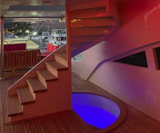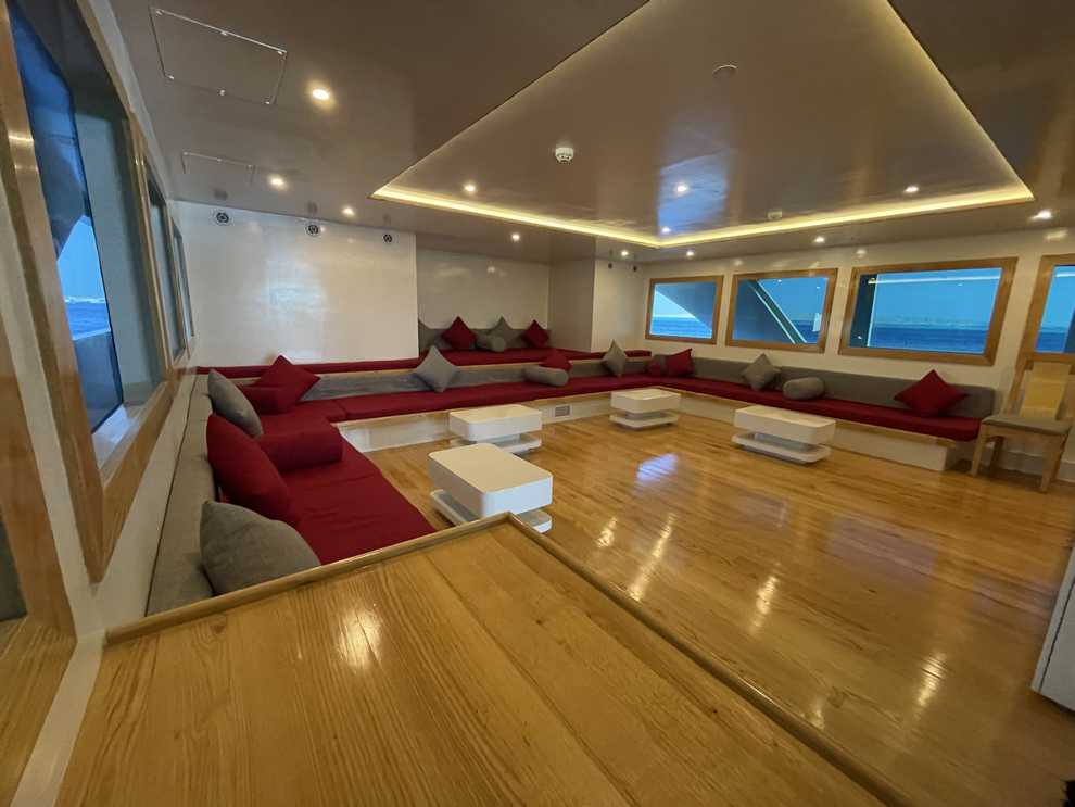 Les espaces communs comprennent un salon intérieur moderne avec wifi, écran plasma et bibliothèque, ainsi qu’un salon extérieur convivial avec bar et divers aménagements pour la détente. Les vastes sundecks, dont un de 145m2, offrent des espaces idéaux pour profiter du soleil ou se relaxer à l’ombre.