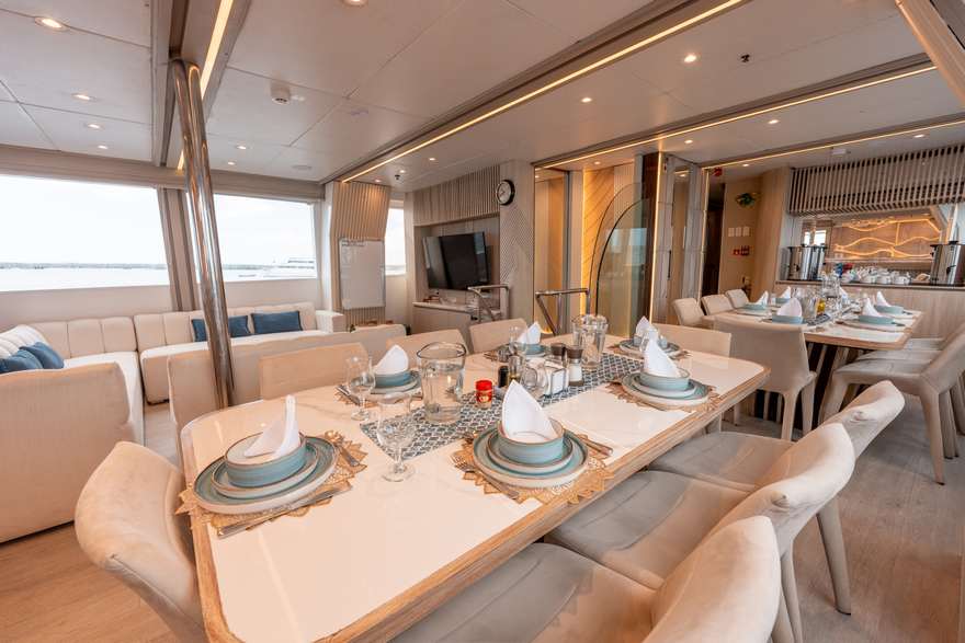Le salon climatisé sur le pont principal comprend des tables pour les repas, une télévision, un lecteur CD / DVD, une vidéothèque et un coin salon.