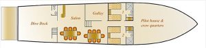 Le pont de plongée est équipé de rangements individuels, d’une grande table pour caméra, d’une station de remplissage d’air et de nitrox, de supports pour les blocs et d’un réservoir séparé de rinçage à l’eau douce pour l’équipement de caméra sous-marine. Les opérations de plongée sont effectuées à partir de deux grands semi-rigides, faciles à embarquer depuis le pont de plongée.
