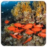Il peut également passer par le site mythique d’Elphinstone. C’est un mont sous-marin allongé, avec des plateaux à nord et sud, de très beaux murs verticaux, des cavernes et surplombs, exposé à des courants forts. La faune présente de grands contrastes avec des petits poissons de récif (anthias, fusiliers, poissons-ange), mais aussi des pélagiques impressionnants (requins, carangues, barracudas), des tortues, et une couverture corallienne très riche (coraux mous, gorgones, éponges).
